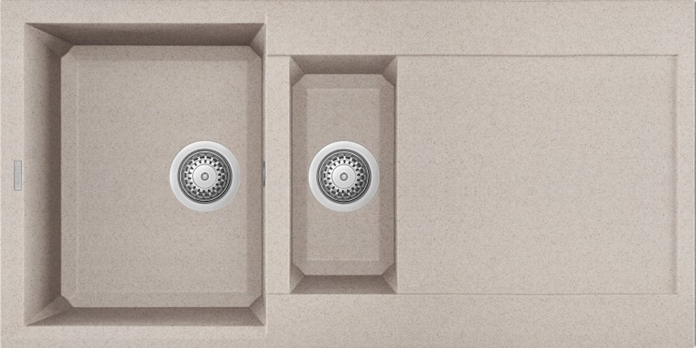 Kuchyňské dřezy se zkosenými hranami. Systém Prisma-clean, který využívá polyedrickou povahu tohoto konkrétního geometrického tvaru, nahrazuje klasický vnitřní zaoblený tvar, za moderní lineární, s prismatickými liniemi, které změkčují vnitřní prostor kuchyňského dřezu a usnadňují jeho čištění při zachování moderního vzhledu a jedinečného estetického výsledku.