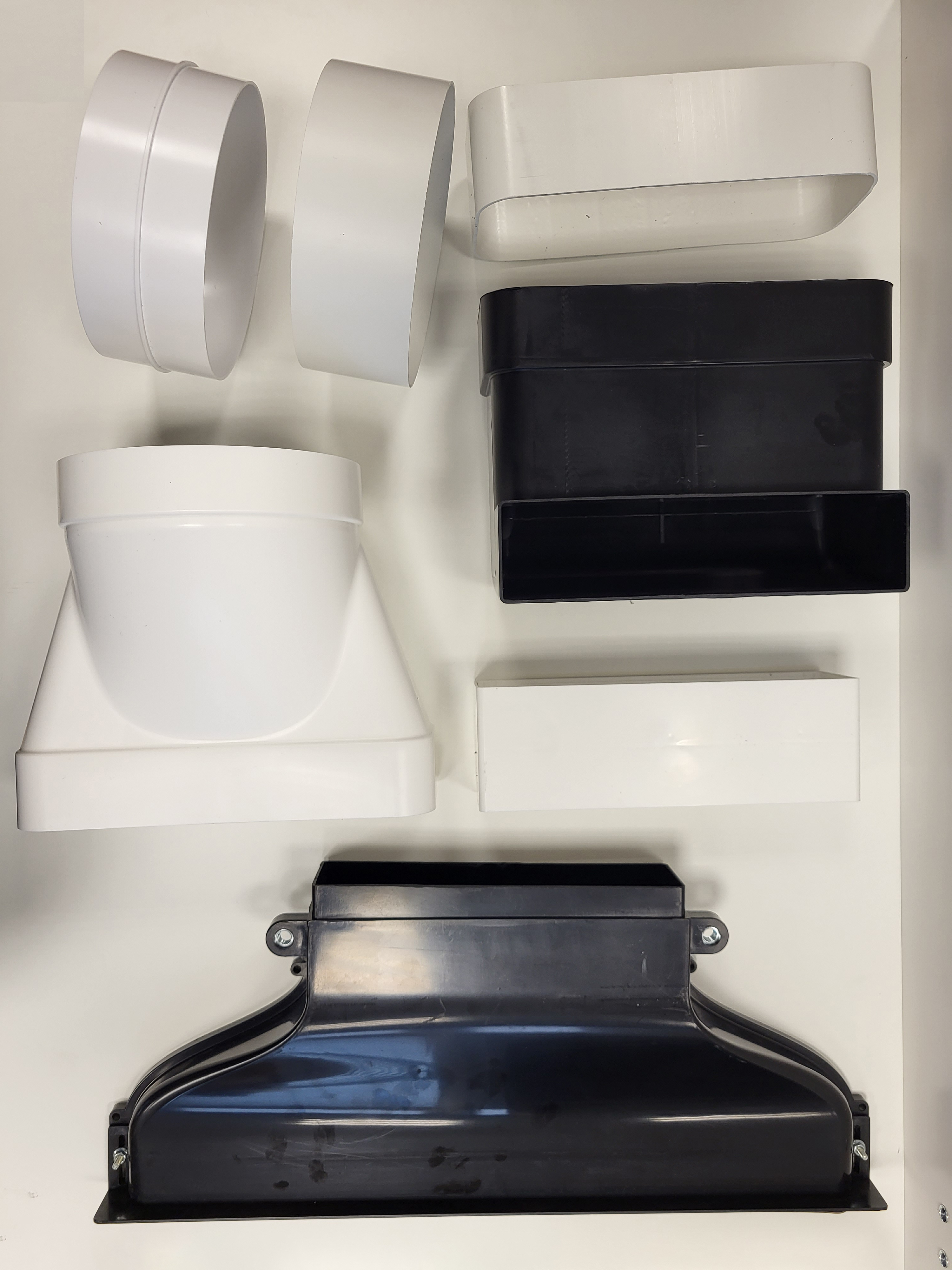 Difuzér s plochým kolenem včetně spojky plochého potrubí a lišty musí být instalovány na skříňku před jejím zavěšením na zeď. Montáž zmiňovaných elementů na již zavěšenou skříň není možná.