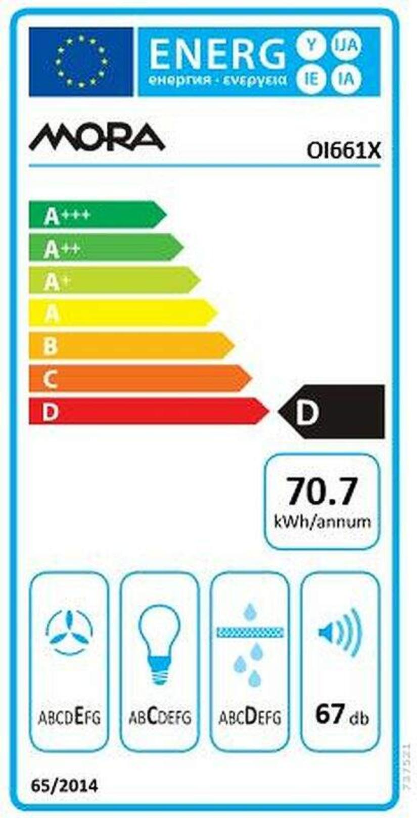 Vestavný odsavač par Mora OI 661 X ve stříbrném provedení je zařazen do energetické třídy D. Maximální výkon odsávání dosahuje 370 m³/hod. Odsavač je vhodný pro montáž s odtahem do komína, nebo s provozem recirkulace. Horní odtah má průměr 120 mm. Vybrat a nastavit si můžete ze 3 rychlostí výkonu pomocí knoflíku, který je umístěn naboku. Maximální hlučnost dosahuje 67 dB. Pracovní plocha pod odsavačem je osvětlena LED osvětlením s výkonem 6 W.