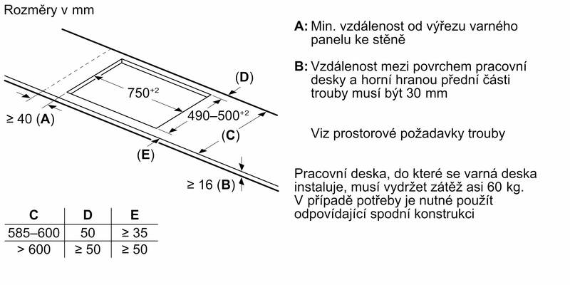 rozměry pro vestavbu (V x Š x H) : 51 x 750 x 490 - 500 mm
