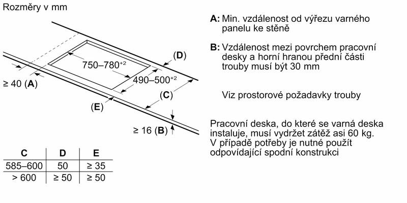 rozměry pro vestavbu (V x Š x H) : 51 x 750 x 490 - 500 mm