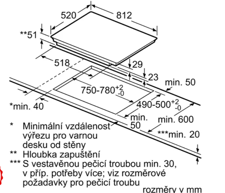 rozměry pro vestavbu (V x Š x H): 51 mm x 750 mm x 490 mm