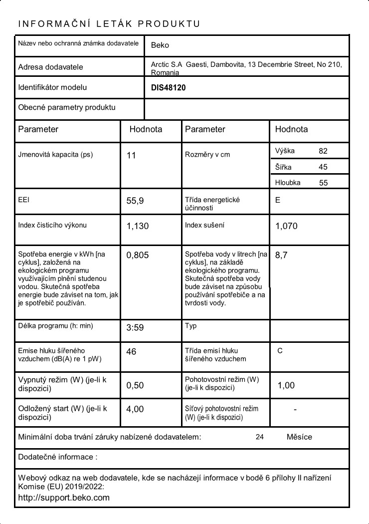 Vestavná myčka Beko DIS 48120 v šířce 45 cm, energetické třídě E pro 11 sad nádobí s AquaIntense ramenem, LED signalizací provozu na podlahu, příbojovou přihrádkou, ProSmart investorovým motorem a 8 programy mytí.