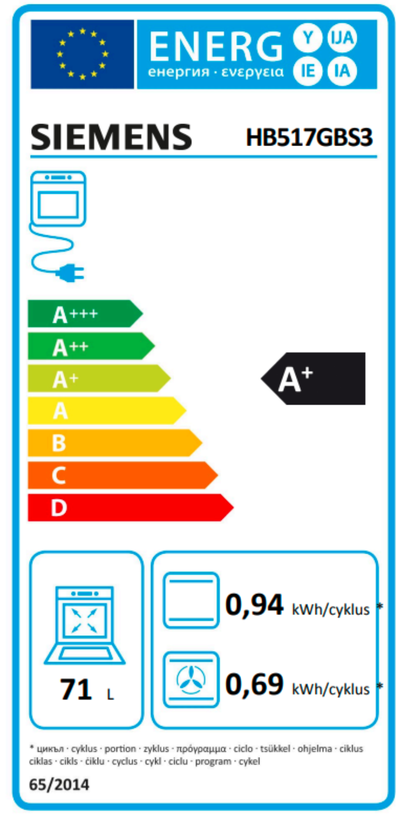 spotřeba energie na cyklus při konvenčním ohřevu:0.9 kWh(na stupnici třidy energetické účinnosti od A+++ do D)